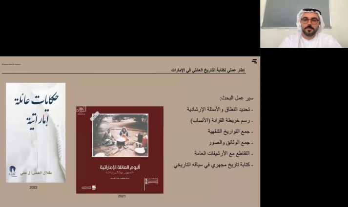 نظم الأرشيف والمكتبة الوطنية محاضرة افتراضية بعنوان “مقاربات تاريخية لكتابة تاريخ الأسرة في إمارات الساحل المتصالح (1860–1960)”، وذلك بالتزامن مع “عام الأسرة”، بهدف تسليط الضوء على أهمية توثيق التاريخ العائلي بوصفه مدخلاً علمياً لفهم جذور المجتمع الإماراتي وتعزيز قيم الانتماء والتواصل بين الأجيال.